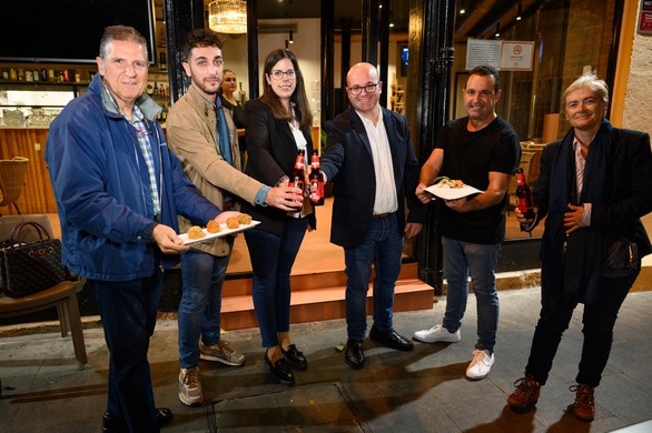 La diputada de Cultura y Cine, Almudena Morales; el concejal de Promoción de la Ciudad, Jesús Luque, y el presidente de ASHAL, Pedro Sánchez, junto al resto de asociados han inaugurado el Festival de Platos de Película con un brindis en ‘La Plazuela’.