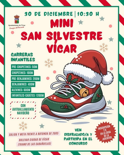 La tercera edición de la Carrera Mini San Silvestre de Vícar harán que las calles de Vícar se llenen de alegría en el penúltimo día del año con una actividad deportiva que aúna la práctica del deporte con la diversión y que está dirigida de un modo muy especial a los niños, a los que se les pide que acudan disfrazados.