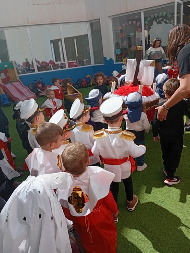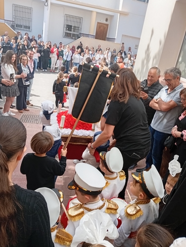 Durante la mañana, el centro educativo se transformó para acoger una auténtica Procesión Infantil, en la que no faltaron detalles propios de una Semana Santa tradicional. Los niños y niñas, ataviados con trajes de mantilla, túnicas, y costales, representaron con entusiasmo y respeto cada uno de los papeles. Uno de los momentos más emotivos fue la salida del trono, llevado por pequeños costaleros, que, al ritmo de la música, recorrió los alrededores del centro.