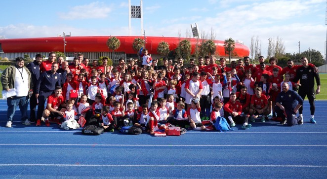 Los niños y niñas inscritos en la actividad de la Fundación del Almería acuden al entrenamiento del primer equipo y conocen el Power Horse Stadium.