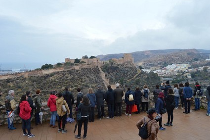 Los turistas han descubierto este sábado una perspectiva de la ciudad diferente, pero igual de bella: una Almería bajo la lluvia, que no ha impedido que puedan disfrutar de una mañana visitando el Cerro de San Cristóbal. Ha sido un recorrido guiado por un cielo de nubes, en un viaje a través de la historia de Almería. El mirador ha permitido pasear por el patrimonio que nos han regalado las diferentes civilizaciones que han vivido en esta tierra, desde la época musulmana hasta la actualidad.