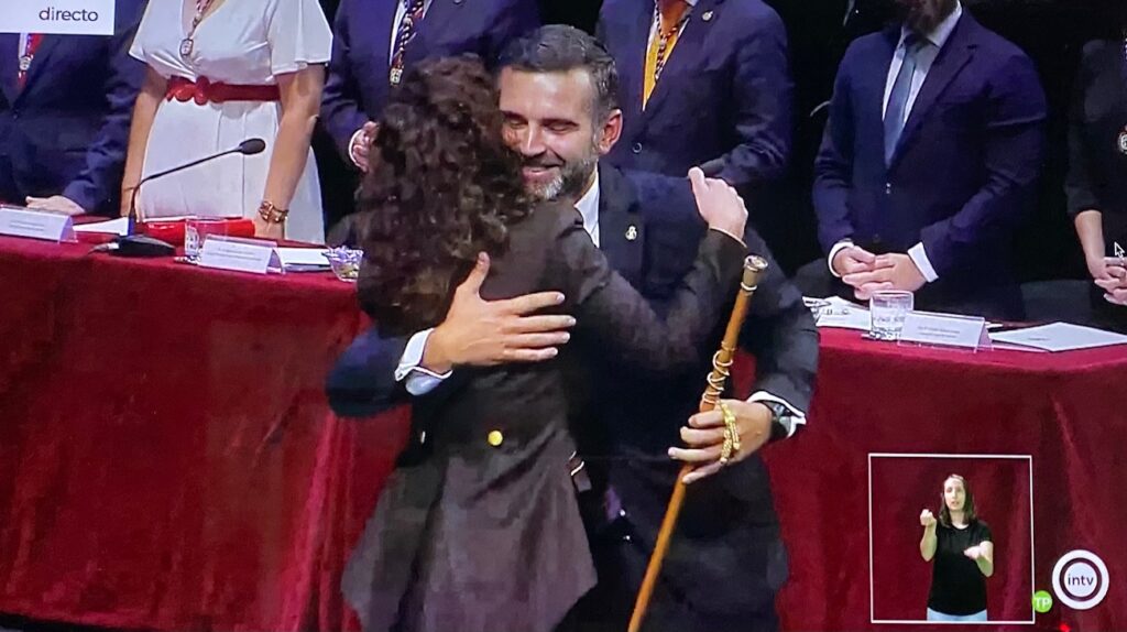 A las 13:14, matemáticamente, María Vázquez se ha convertido en la primera alcaldesa de Almería, con 14 votos a favor y ha recibido el bastón de mando de la Ciudad de manos del anterior alcalde, Ramón Fernández-Pacheco, consejero de Sotenibilidad y Medio Ambiente de la Junta de Andalucía.