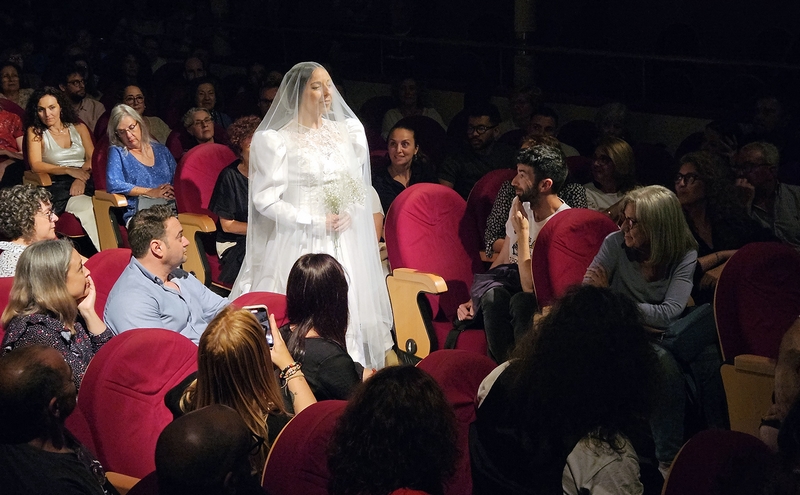 En ‘Puta, Madre y Loca’ no iba a ser diferente. Refuerza sus valores intrínsecos haciendo una propuesta tan epatante –como ese inicio con entrada desde el fondo del teatro, con traje de novia y bailando bajo una cruz proyectada en el escenario con distorsión de guitarras eléctricas- como divertida y, a la vez, poniendo sobre la mesa una cruda reflexión sobre el precio de cada cual en el día a día… “¿Cuánto estáis dispuestos a dar?”. Desde una contumaz sonrisa cuando no apetece al acto físico de la prostitución en sí misma, “¿cuál es vuestro precio?”.