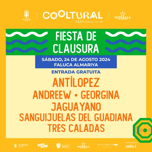 Si la fiesta de bienvenida de Cooltural Fest se ha consolidado en su programación desde su primer año ahora nace la fiesta de clausura. Una cita que servirá para despedir la edición por todo lo alto, con un cartel divertido y variado, que se desarrollará en el ‘Escenario Playa’ que se sitúa junta a la Faluca. Una última jornada de música en directo que contará con los siempre divertidos Antílopez, las canciones preciosistas de Georgina, el pop-rock de cuna madrileña de Tres Caladas, la música desenfadada de Jaguayano, el R&B de Andreew, o la fusión moderna y folclórica de los extremeños Sanguijuelas del Guadiana.
