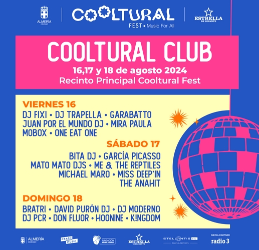 ‘Cooltural Club’ será un escenario por el que pasarán tanto DJs como bandas emergentes, la idea es trasladar ese espíritu de club musical donde se pueden conocer a nuevos talentos, además de sumergirse en las mejores sesiones entre actuación y actuación. Concretamente, el viernes, 16 de agosto estarán Juan Por El Mundo, DJ Fixi, One Eat One, Mira Paula, DJ Trapella, Garabatto y Mobox. El sábado 17 será el turno de Michael Maro, Mato Mato Djs, The Anahit, García Picasso, Me & The Reptiles, Bita DJ y Miss Deep’in. Para cerrar el domingo, día 17, con DJ PCR, DJ Moderno, Kingdom!, Hoonine, Bratri, David Purón DJ y Don Fluor.