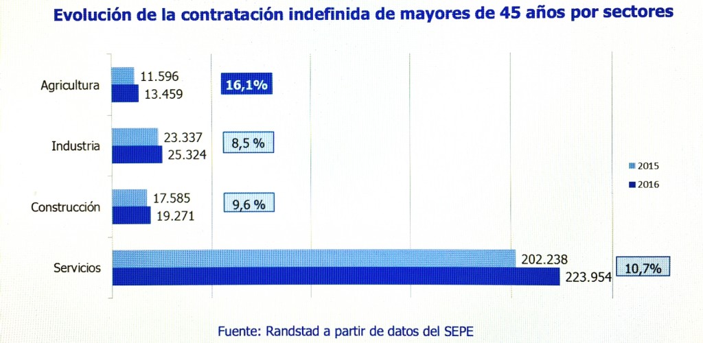 Randstad analiza este colectivo en función del sector en el que trabaja el profesional. Los contratos indefinidos firmados por mayores de 45 años durante 2016 crecen en todos los sectores analizados. Agricultura es el sector que registra mayor aumento, donde la contratación indefinida ha crecido un 16,1% en el último año, alcanzando los 13.459 contratos a mayores de 45 años. Le sigue el sector servicios, con un aumento del 10,7%, creciendo desde los 202.238 contratos indefinidos en 2015 a los 223.954 registrados en el último año. Por debajo de los dígitos, la construcción y la industria también registran un aumento de este tipo de contratos, creciendo un 9,6% y un 8,5%, respectivamente.