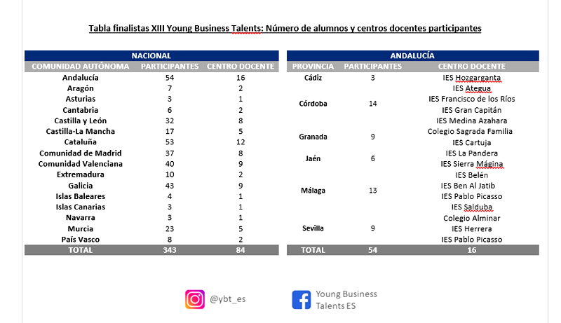 Tabla finalistas XIII Young Business Talents: Número de alumnos y centros docentes participantes