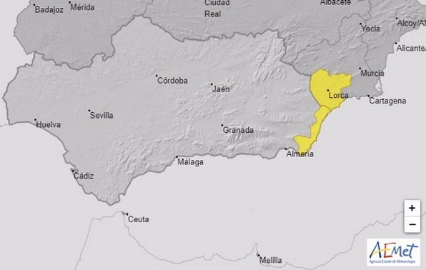 El aviso amarillo, con una probabilidad de entre el 40 y 70 por ciento, continúa vigente en la provincia después de que en la jornada anterior se alertara también por lluvias en las zonas del Valle del Almanzora y Los Vélez, lo que estuvo vigente hasta la medianoche, según la información ofrecida por la Aemet.
