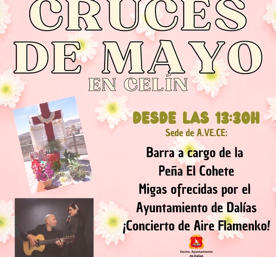El Ayuntamiento de Dalías invita a todos los vecinos y visitantes a unirse a la celebración de las Cruces de Mayo en Celín, un evento emblemático que el primer día de mayo marca el inicio de la concurrida programación de la Fiesta de la Primavera, que se prolongará del 1 al 5 de mayo.