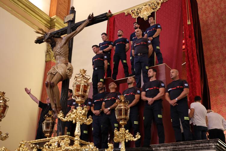 Tras esta misa que ha estado oficiada por el obispo, Don Antonio Gómez, se ha llevado a cabo la bajada de la imagen por parte de los miembros del Consorcio de Bomberos del Poniente.