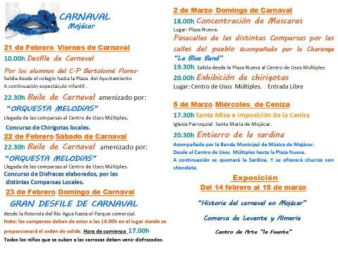 En el programa adjunto se detallan fechas, horarios e itinerarios de Concursos, Bailes, y la exposición ‘Historia del Carnaval en Mojácar’ que se podrá visitar hasta el próximo día 15 de marzo en el Centro de Arte ‘La Fuente’.