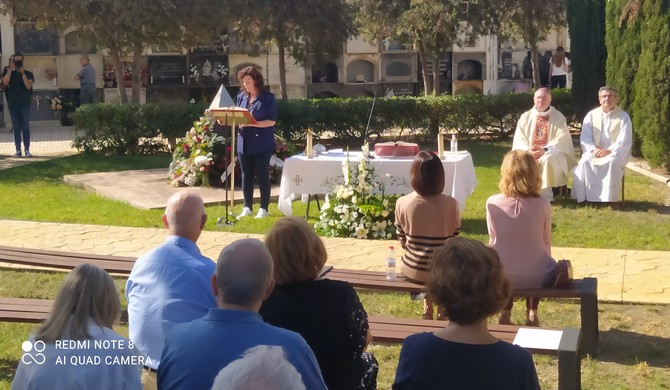 A las doce horas, con un sol de justicia y gracias a las sombras de los altos y verdosos cipreses, en el Jardín del Recuerdo situado en vetusto Cementerio de San José y Santa Adela, según una plaquita colocada en la puerta de entrada principal el Campo Santo de Almería, tuvo lugar en este Día de Todos los Santos, la celebración de la Santa Misa oficiada por el Obispo, Monseñor Antonio Gómez Cantero, asistido en el Altar Mayor, colocado al efecto, por el Vicario de Pastoral y Evangelización, canónigo Francisco Sáez Rozas, y con la presencia institucional de la Alcaldesa – Presidenta del Ayuntamiento de Almería, María del Mar Vázquez Agüero, quien ha leído la primera de las Lecturas, y las concejalas delegadas de Servicios Municipales y Playas, María Sacramento Sánchez Marín, y de Familia, Igualdad y Participación Ciudadana, Paola Laynez Guijosa.