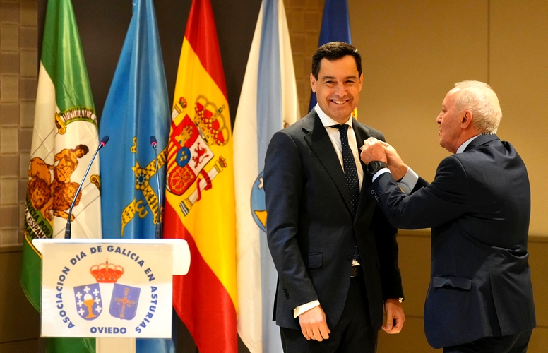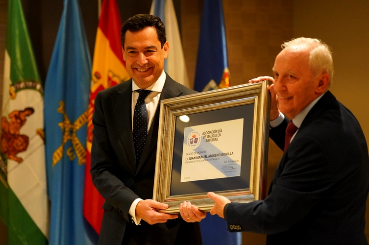 El presidente de la Junta de Andalucía, Juanma Moreno, que ha recibido hoy en Oviedo la Insignia de Oro y el título de socio de honor de la Asociación del Día de Galicia en Asturias, ha instado a seguir trabajando de forma conjunta por la solidaridad, la igualdad y la cooperación de todos los territorios y ha recordado a todos los andaluces que se sienten orgullosos de ser españoles y de compartir este sentimiento por esta nación.