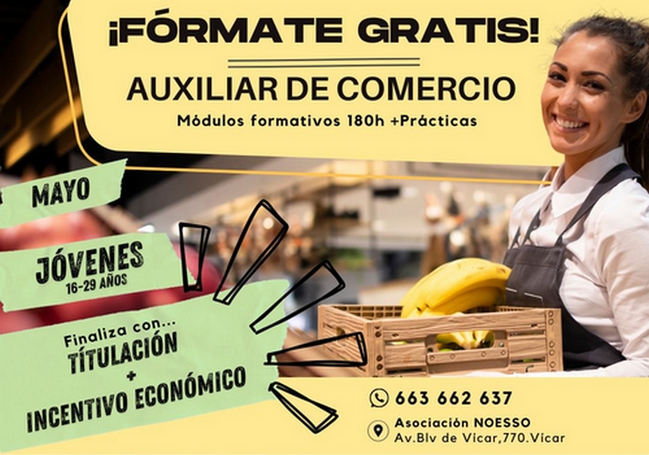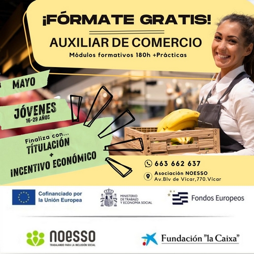 La Asociación Noesso, con sede en Vícar, ha abierto la convocatoria de solicitud de plaza para un curso de Auxiliar de Comercio que se va a desarrollar este mes en la sede de la asociación. Se trata de un curso gratuito dirigido a jóvenes entre 16 y 29 años, de 180 horas lectivas, a las que habrá que añadir las prácticas en empresas del sector. El curso forma parte de las acciones formativas de este año 2025, que lleva a cabo la asociación Noesso de Vícar, y cuenta con la colaboración de la Obra Social “La Caixa”. Para el alcalde de Vícar, Antonio Bonilla, “es importante mantener nuestra predisposición a colaborar en cuantas iniciativas de ámbito formativo y social se llevan a cabo en el municipio por parte de los diferentes colectivos y asociaciones”.