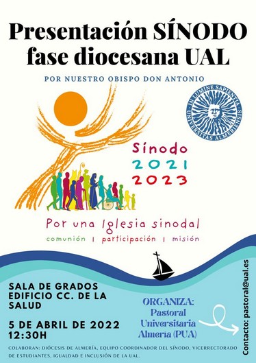 El salón de grados del edificio de Ciencias de la Salud de la UAL acogerá el próximo martes, 5 de abril, a las 12 y media, la presentación de la fase diocesana del Sínodo a toda la comunidad universitaria. Será nuestro obispo D. Antonio quien se encargue de explicar a profesores, alumnos y personal no docente las claves de la de este momento eclesial tan importante de reflexión y discernimiento que está viviendo nuestra iglesia.
