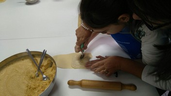 HUÉRCAL-OVERA.- Padres e hijos aprenden a elaborar la tradicional empanada de almendra en un taller