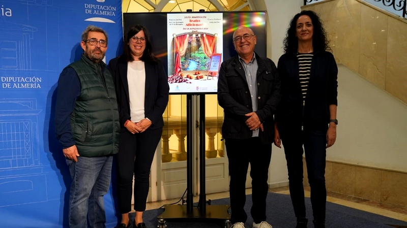 La vicepresidenta y diputada de Cultura, Cine e Identidad Almeriense, Almudena Morales; el presidente de Abuxarra, Juan José Bonilla, la coordinadora de la muestra, Mónica González, y el alcalde de Paterna del Río, José Asensio, han dado más detalles de esta muestra abierta a todos los públicos y que se destina principalmente a los grupos de teatro aficionado que hay en la Alpujarra.