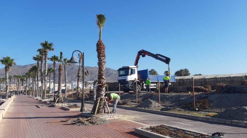 Plantación de con una quincena de palmeras en el Paseo Marítimo del Censo, en Adra