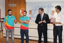 El concejal de Deportes del Ayuntamiento de Almería, Juan José Alonso, y el director general de Deportes de la Diputación Provincial, Juan José Salvador, han recibido en la Sala de Prensa del Estadio de los Juegos Mediterráneos a los dirigentes, técnicos, jugadores y familiares del Cajamar CD Urci infantil masculino que se acaba de proclamar campeón de Andalucía en Algeciras.