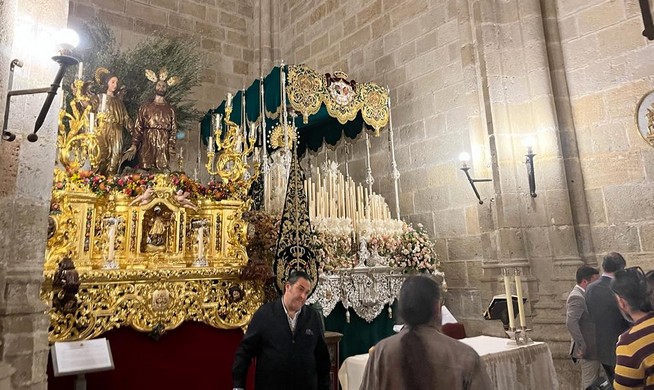 La última de las visitas del recorrido ha sido para la Hermandad del Santísimo Cristo del Mar, Nuestra Señora de las Lágrimas y San Juan Evangelista en el monte Calvario, ubicada en la Iglesia de San Roque del barrio de Pescadería.