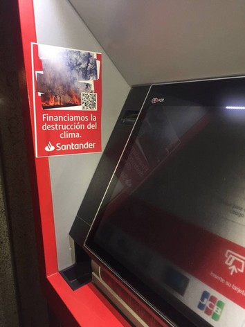 En los cajeros y sucursales de Banco Santander se han colocado carteles para denunciar algunas de las inversiones más destructivas para el medio ambiente que realiza el banco. La acción de protesta coincide con una iniciativa similar realizada en la ciudad de Glasgow y con celebración de la huelga global por la justicia climática.