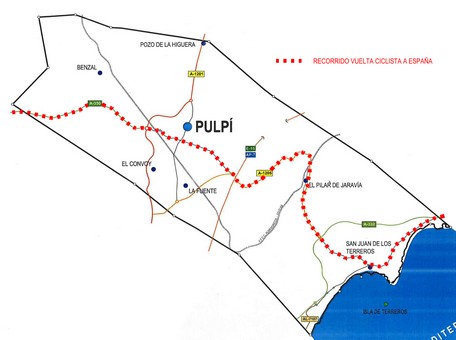 El alcalde de Pulpí, Juan Pedro García, invita a pulpileños y visitantes a disfrutar el próximo jueves, 30 de agosto, del paso de la sexta etapa de la Vuelta Ciclista a España por el municipio de Pulpí. El recorrido y horarios aproximados son los siguientes: