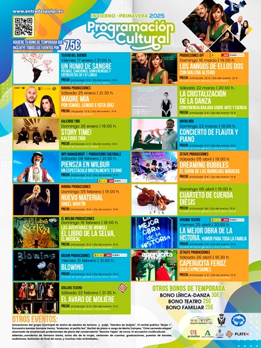 Para este 2025, además del bono general de temporada, que incluye todos los eventos de la programación (75€) y que ya podéis adquirir en www.entradaspulpi.es, como novedad, se podrán adquirir bonos de temporada específicos para cada género cultural: bono lírica-danza (30€) ya que incluye el Concierto de Año Nuevo 2025, bono teatro (25€) y bono familiar (25€), con los que acceder a eventos concretos.