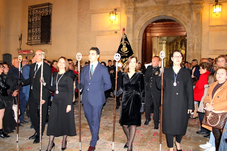En la solemne procesión del Viernes Santo, La Esperanza mostrará el nuevo bordado del palio que se ha visto completado con la bambalina trasera, ejecutada en oro y sedas por la prestigiosa bordadora lorquina María Pérez. Además, la Santísima Virgen lucirá ‘Saya del Jubileo’ bordada en oro y seda sobre tisú por el toledano Antonio Alcaide.