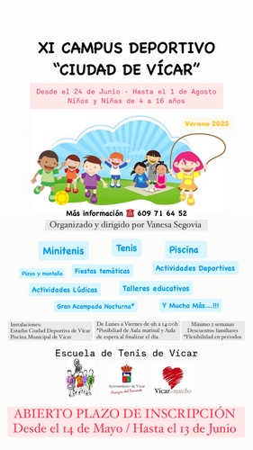 Por otra parte, desde la Escuela de Tenis de Vícar organizan el XI Campus Deportivo ‘Ciudad de Vícar’ que se desarrolla en las instalaciones del estadio municipal. En esta ocasión, se extenderá desde el pasado martes 24 de junio hasta el 1 de agosto con posibilidad de aula matinal y aula de espera. Además de las actividades deportivas y visita a la Piscina Municipal, habrá fiesta temática y excursiones.