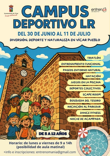 Dentro del área deportiva existen una gran variedad de campus de verano que permiten a los niños y niñas disfrutar de las jornadas estivales en un entorno activo, al aire libre y de compañerismo. Dentro de este apartado se encuentra, por ejemplo, el Campus Deportivo LR que se desarrollará en la Villa de Vícar del 30 de junio al 11 de julio en horario de mañana de lunes a viernes. Dentro de su programación figuran actividades como triatlón, entrenamiento funcional, juegos en la piscina o scape room.