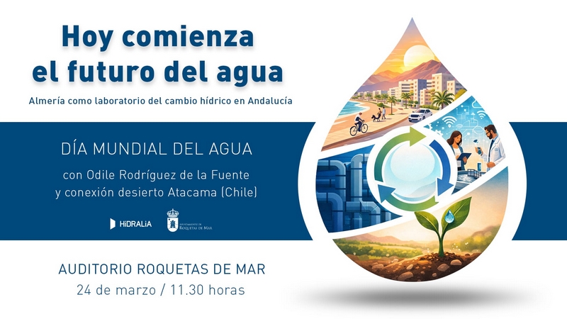 Roquetas de Mar acogerá el próximo 24 de marzo, desde las 11:30 horas en su Auditorio, la celebración del Día Mundial del Agua con un acto abierto hasta completar aforo, de carácter divulgativo e institucional, presentado por la periodista Mónica Aldehuela, que situará a Almería en el centro del debate hídrico andaluz. Bajo el lema “Hoy comienza el futuro del agua”, el encuentro se plantea como una reflexión estratégica sobre uno de los grandes desafíos de Andalucía: la gestión sostenible de los recursos hídricos en un contexto marcado por el cambio climático, y con un clima mediterráneo condicionado por una sequía estructural.