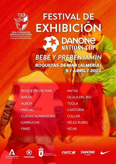 El próximo sábado 9 de abril Roquetas de Mar será sede del Festival Exhibición Danone Nations Cup Bebé y Prebenjamín. Se trata de un torneo en el que participarán un total de 14 equipos, dos de ellos procedentes de fuera de la provincia, en concreto, competirán las escuelas, en la categoría de bebé (5 y 6 años) y prebenjamín (7 y 8 ochos años), de Roquetas de Mar, Baeza, Macael, Cuevas del Almanzora, Garrucha, Fines, Antas, Olula del rio, Cantoria, Tíjola, Cúllar, Vélez Rubio y Vícar.