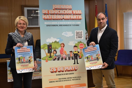 La teniente alcalde del Ayuntamiento de Roquetas de Mar, Eloísa Cabrera, y el agente de Policía Local y promotor del proyecto Roquetas de Mar Educación Vial, Ricardo Alemán, han presentado este miércoles la primera jornada de educación vial materno infantil que tendrá lugar el próximo 26 de mayo de forma gratuita para los profesionales de los cuerpos y fuerzas de seguridad. La calidad de los ponentes y los objetivos del curso lo convierten en una cita de transcendencia nacional con el objetivo de seguir trabajando en la prevención para mejorar la seguridad vial, intercambiar experiencias y crear un protocolo de actuación ante accidentes de tráfico, principalmente en aquellos en los que se vean implicados mujeres embarazadas y niños.