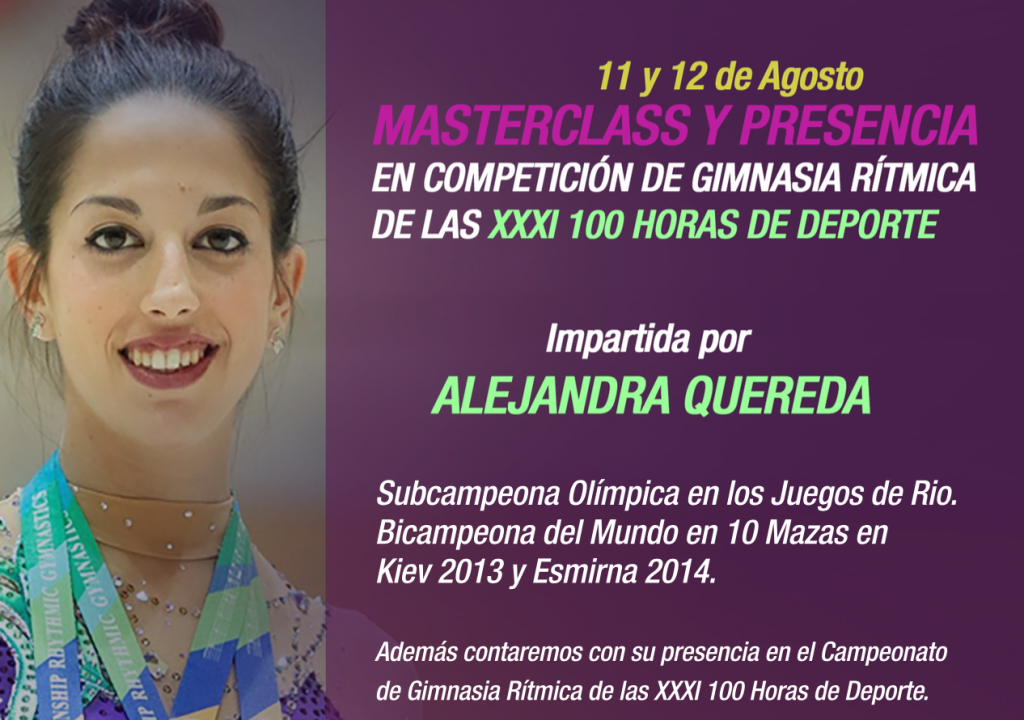 Para cumplir esos objetivos, nada mejor que contar con uno de los referentes actuales de la gimnasia rítmica española. La gimnasta Alejandra Quereda, bicampeona del Mundo y subcampeona olímpica, impartirá una clase magistral en Las 100 Horas. El 11 de agosto por la tarde, en horario de 16 a 20:30 horas, Quereda impartirá su docencia para aquellas personas que decidan inscribirse. La competición se disputará el día 12 por la mañana. La clase y la competición se celebrarán en el Pabellón Infanta Cristina.