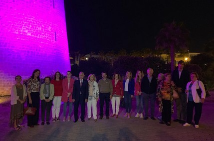 El Castillo de Santa Ana de Roquetas de Mar se iluminó este pasado viernes noche de rosa, en la víspera de la conmemoración, este 19 de octubre, del Día de la Lucha contra el Cáncer de Mama. Al acto de concienciación asistió el alcalde, Gabriel Amat, el diputado nacional Juanjo Matarí y los concejales Rocío Sánchez, Juanjo Salvador, Loles Moreno y María Ángeles Alcoba, junto a los miembros de la directiva local de la Asociación Española contra el Cáncer (AECC), encabezados por la presidenta, Carmen Fernández, y la gerente del Distrito Sanitario Poniente, Emilia Martín. El alcalde manifestó “el apoyo de todos los roqueteros, a las mujeres que luchan día a día contra el cáncer de mama y nos dan ejemplo con su valentía” y tuvo un “cariñoso recuerdo para aquellos que han perdido a un familiar por esta terrible enfermedad”.