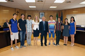 ROQUETAS DE MAR.- Gabriel Amat, Eloísa Cabrera y María Dolores Ortega reciben a alumnos roqueteros que han destacado en diversas fuentes de conocimiento.