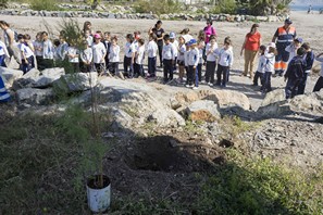 ROQUETAS DE MAR.- Los alumnos del colegio Portocarrero plantan una docena de tarayes para conmemorar el Día del Árbol