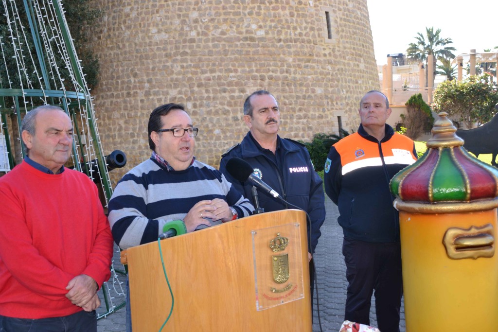 Castillo de Santa Ana se prepara estos días para recibir a sus huéspedes más especiales. Los Reyes Magos se alojarán en el monumento roquetero en la noche más mágica del año, pero antes recorrerán las calles del municipio para saludar a los niños y recoger sus cartas. Los detalles de esta cabalgata han sido presentados esta mañana por el concejal de Deportes y Tiempo Libre, José Juan Rubí, en la plaza del Castillo, en el mismo punto donde el viernes el alcalde del municipio recibirá a Sus Majestades a las 19 horas antes de que inicien su recorrido. Y lo ha hecho acompañado por el concejal de Aseo Urbano, Pedro Antonio López, el intendente mayor de la Policía Local, Miguel Ángel López, y el coordinador de Protección Civil, Antonio Padilla, responsables de los dispositivos de limpieza y seguridad.