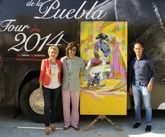 ROQUETAS DE MAR.- Morante de la Puebla, el pintor Alex Rodríguez, autor de la obra, y Eloísa Cabrera presentan el diseño del cartel de la Feria Taurina Santa Ana 2014.