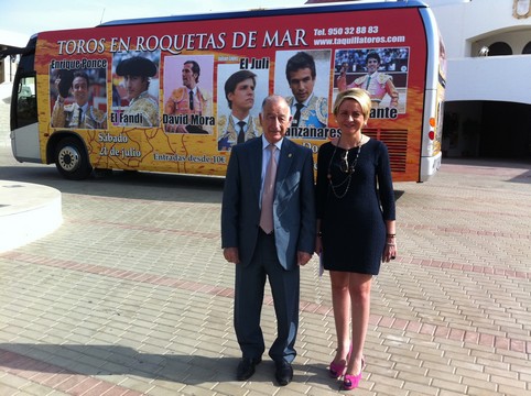 El alcalde de Roquetas de Mar, Gabriel Amat, y la Teniente Alcalde, Eloisa Cabrera, han presentado un autobús que promocionará la ciudad en distintas provincias del sureste español. Esta iniciativa es pionera ya que a la vez de publicitar turísticamente la localidad, promocionará la feria taurina Santa Ana 2012.
