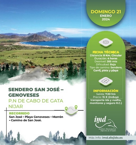 La primera ruta del año tendrá lugar en el Parque Natural Cabo de Gata-Níjar el domingo 21 de enero. Se trata del sendero San José-Genoveses, una ruta circular de 8 kilómetros con una duración aproximada de 4 horas y dificultad baja.