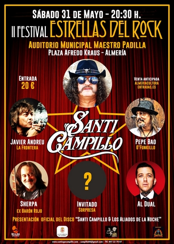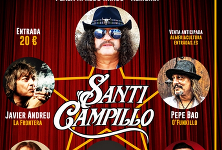 El que fuera fundador de M-Clan presentará su disco ‘Santi Campillo & Los Aliados de la Noche’ y para el concierto de Almería contará como invitados con Javier Andreu –la inconfundible voz de La Frontera-, Pepe Bao –el virtuoso bajista que ha trabajado desde con leyendas del flamenco o el jazz pasando por su banda O’Funk’Illo-, Sherpa –vocalista de la época más exitosa y triunfal de Barón Rojo-, el guitarrista de rockabilly y rock clásico Al Dual y hasta un invitado sorpresa que se desvelará la misma noche del concierto, el 31 de mayo a partir de las 20.30 horas.