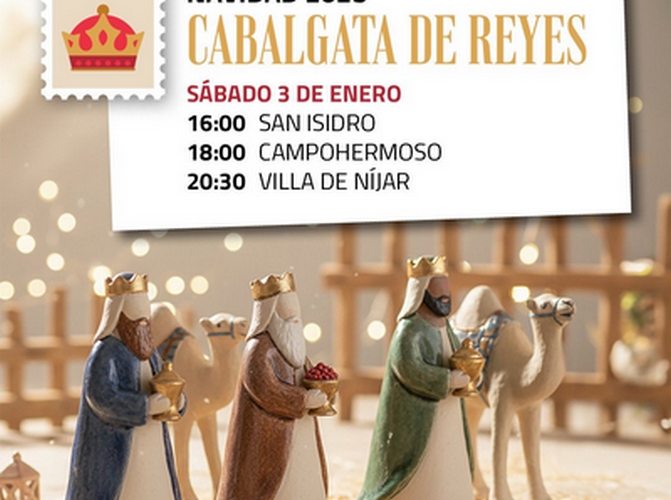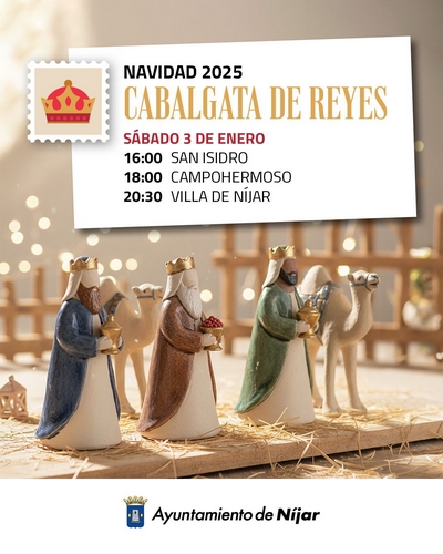 . El Ayuntamiento de Níjar informa que, debido a la previsión meteorológica, se adelantan las cabalgatas de los Reyes Magos, que de este modo se desarrollarán mañana, sábado, día 3 de enero. Y es que la Agencia Estatal de Meteorología (AEMET) apunta a una probabilidad de lluvias del cien por cien tanto para la jornada del domingo como para el lunes, motivo por el cual se ha tomado esta decisión por parte del Consistorio nijareño.