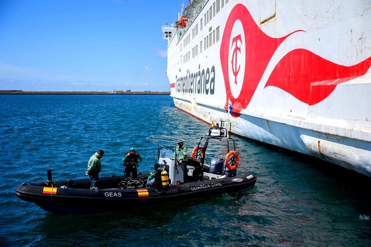 El ejercicio práctico, realizado en la pasada semana, ha consistido en la búsqueda de un posible artefacto explosivo en el buque Almariya, tras el aviso de amenaza de bomba. Ante la indeterminación de la ubicación exacta del supuesto artefacto, Guardia Civil y los grupos TEDAX y GEAS han comenzado su búsqueda terrestre en la bodega del buque y subacuática por el casco del barco, previa realización de todas las comunicaciones a los organismos implicados, para que se personen en el puesto de mando avanzado, ubicado en las inmediaciones de la zona de atraque, desde donde se han coordinado las actuaciones.