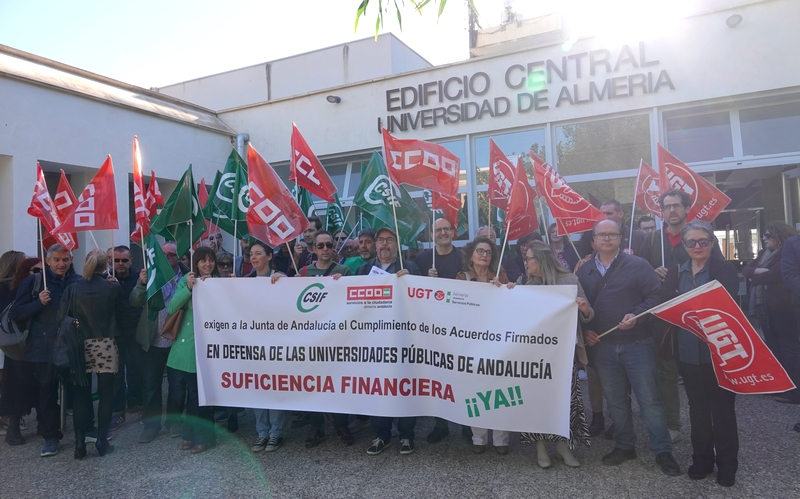CSIF, CCOO y UGT se han concentrado esta mañana en el Edificio Central de la Universidad de Almería para reclamar a la Junta de Andalucía cumpla los acuerdos firmados en el modelo de financiación de universidades y convoque cuanto antes la Comisión de Seguimiento del Acuerdo del PDI, así como la Mesa Sectorial del PTGAS.
