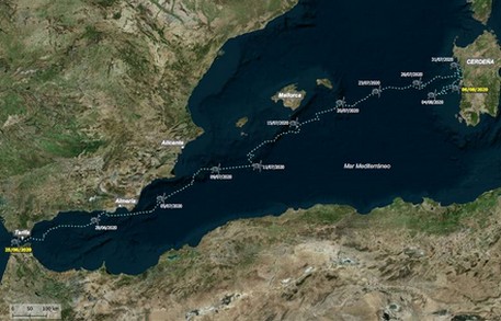 La aventura de Sparrow discurre desde entonces por el Mediterráneo, recorriendo durante la primera semana la costa de Málaga (entre los días 26 al 29 de junio) y Almería (del 29 de junio al 4 de julio). Desde allí pasó a surcar la costa alicantina (entre los días 9 y 10 de julio), tras pasar por aguas de Murcia los días precedentes (del 4 al 9 de julio). En la actualidad, este singular ejemplar de tortuga boba sigue su viaje por este amplio mar, germen de grandes culturas desde la antigüedad. A finales de la semana pasada llegaba a aguas del archipiélago balear y en las inmediaciones de la isla de Mallorca se encontraba ya el pasado 15 de julio. Un mes después de su liberación, el pasado 27 de julio se alejaba ya de las Baleares en donde sí ha permanecido varios días en la misma localización, llegando a Cerdeña donde se encontraba el jueves 6 de agosto, conforme al último informe recibido, el cual puede actualizarse gracias a la referida marca satelital de que dispone.