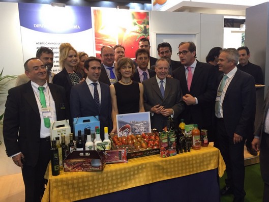 La ministra de Agricultura, Alimentación y Medio Ambiente, Isabel García Tejerina ha visitado este lunes el stand de la Diputación de Almería tras la inauguración del Salón de Gourmets (Madrid, del 13 al 16 de abril) y ha sido recibida por el diputado de Agricultura, Óscar Liria, y por los empresarios almerienses que participan en el evento bajo el paraguas de la Institución Provincial. En su contacto con el área de Agricultura, Tejerina ha subrayado el liderazgo de Almería en la producción de frutas y hortalizas, al tiempo que ha destacado la importante industria agroalimentaria almeriense creada en torno a una materia prima de gran calidad.