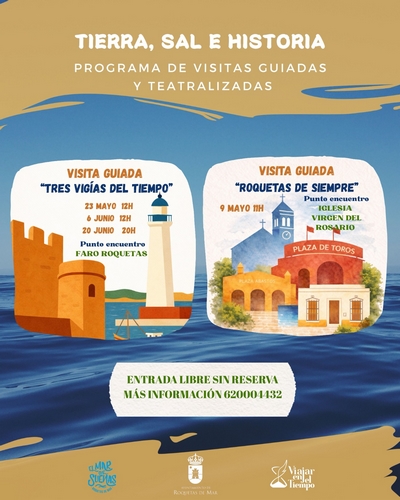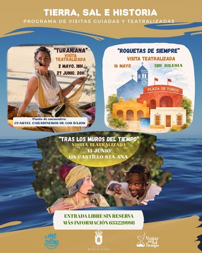 Además, el programa incorpora visitas teatralizadas que recrean episodios históricos y escenas del pasado, como “Turaniana” (2 de mayo y 27 de junio), “Roquetas de siempre” teatralizada (16 de mayo) y “Tras los muros del tiempo” (13 de junio en el Castillo de Santa Ana).