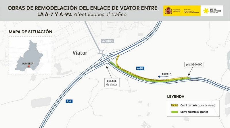 El Ministerio de Transportes y Movilidad Sostenible está ejecutando las obras de remodelación del enlace entre la Autovía del Mediterráneo (E-15/A-7) y la A-92 en Viator, en la provincia de Almería, con un presupuesto vigente de obras de 38 millones de euros (IVA incluido). El objetivo es la ampliación de la capacidad del Enlace de Viator mediante la ejecución de cuatro nuevos ramales directos entre las autovías A-7 y A-92 y el rediseño de los cuatro ramales del enlace actual.