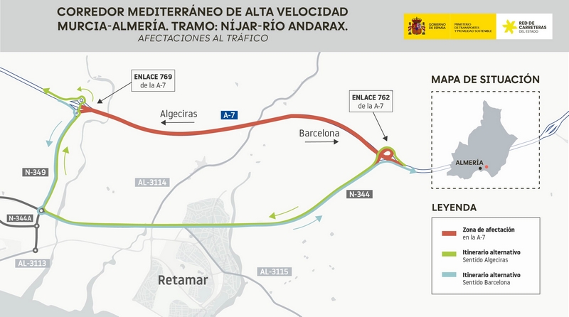 El Ministerio de Transportes y Movilidad Sostenible, a través de Adif AV, avanza con las obras del tramo Níjar-Río Andarax de la futura Línea de Alta Velocidad (LAV) Murcia-Almería, una infraestructura clave del Corredor Mediterráneo. Dicho tramo, de 25,5 kilómetros de longitud, cuenta con una inversión cercana a los 150 millones de euros.
